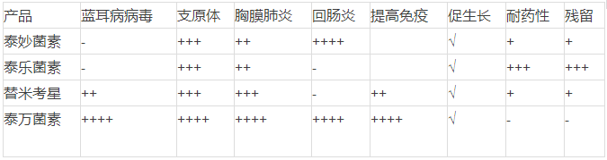 泰萬菌素與其它相關產品的功能對比情況