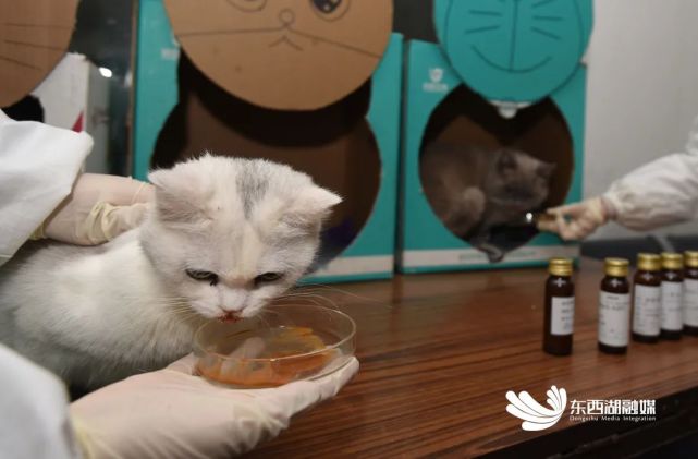 ●回盛生物寵物觀察室內(nèi),貓咪正對(duì)保健口服液樣品大快朵頤。