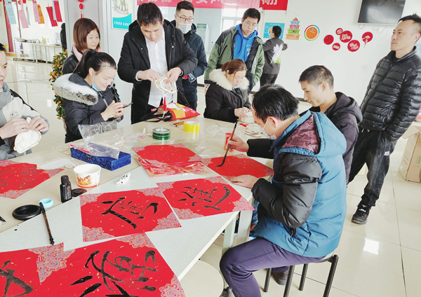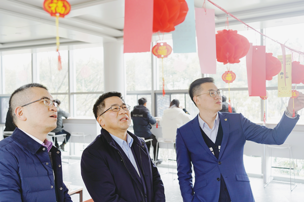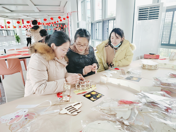 猜字謎、套圈圈、寫福字、花燈DIY等游戲體驗區是最受大家歡迎的區域。紅色的謎面與紙燈籠懸掛在半空中,烘托出了濃濃的節日氣氛,200多條字謎涵蓋了歷史、文化、生活常識等方方面面的知識。參與活動的員工觀謎面、猜謎語、兌謎底,或獨自閉目思索,或三三兩兩地競猜討論;在寫福字和花燈DIY區域,大家領取花燈材料、筆墨紙硯圍坐一圈,或揮毫潑墨,或精雕細琢,寫著吉祥寓意的福字畫,享受動手帶來的快樂,用自己的雙手寫下新年的心愿,承載起虎年的祝福。