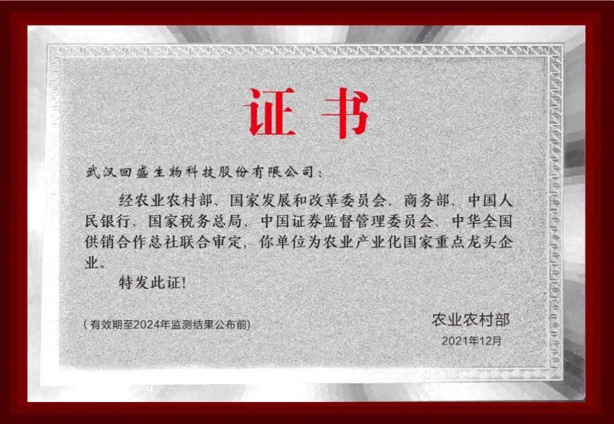 回盛生物獲“農業產業化國家重點龍頭企業”稱號