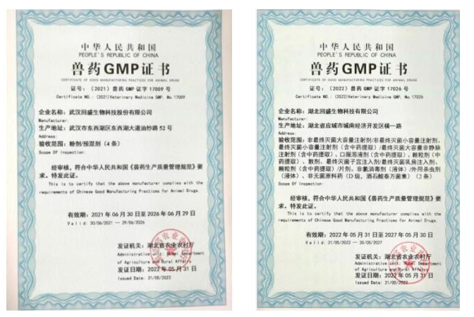 2022年5月31日,湖北省農業農村廳為武漢回盛、湖北回盛分別下發國家獸藥GMP證書、獸藥生產許可證。