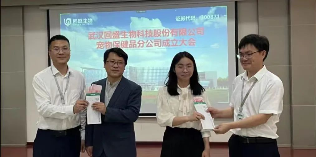 2022年2月25日,湖北省動保技術開發有限公司成立;2022年4月26日,武漢回盛生物科技股份有限公司寵物保健品分公司正式注冊成立,分公司在公司張柏路研發基地舉辦了成立大會。