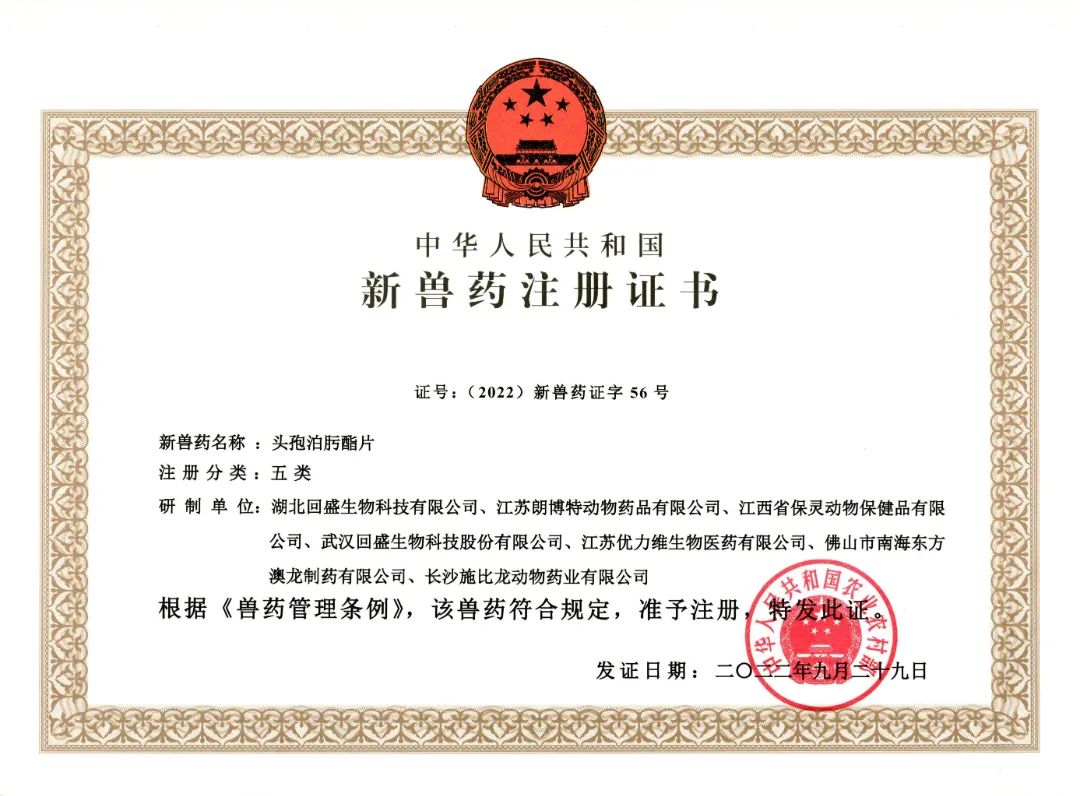 回盛生物獲“頭孢泊肟酯片”新獸藥注冊證書